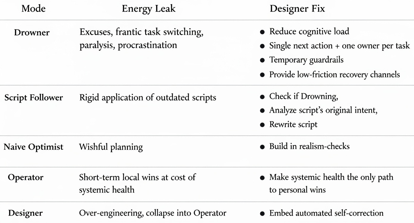 The Designer sees that there is too much passive behavior. They diagnose the modes: Drowners are too exhausted to care, while Script Followers are waiting for permission.